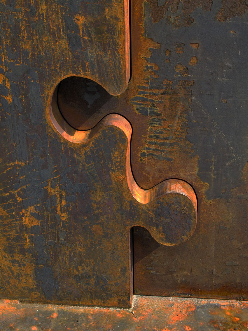 Zwei verschieden große, massive Stahlblöcke sind mit passgenau ineinandergreifenden Nasen und Buchten annähernd spielfrei gefügt. Der Versatz der beiden Blöcke ist gering und gibt lediglich der Fügekontur schärferen Kontrast. Nach oben hin streben die beiden Blöcke auseinander.