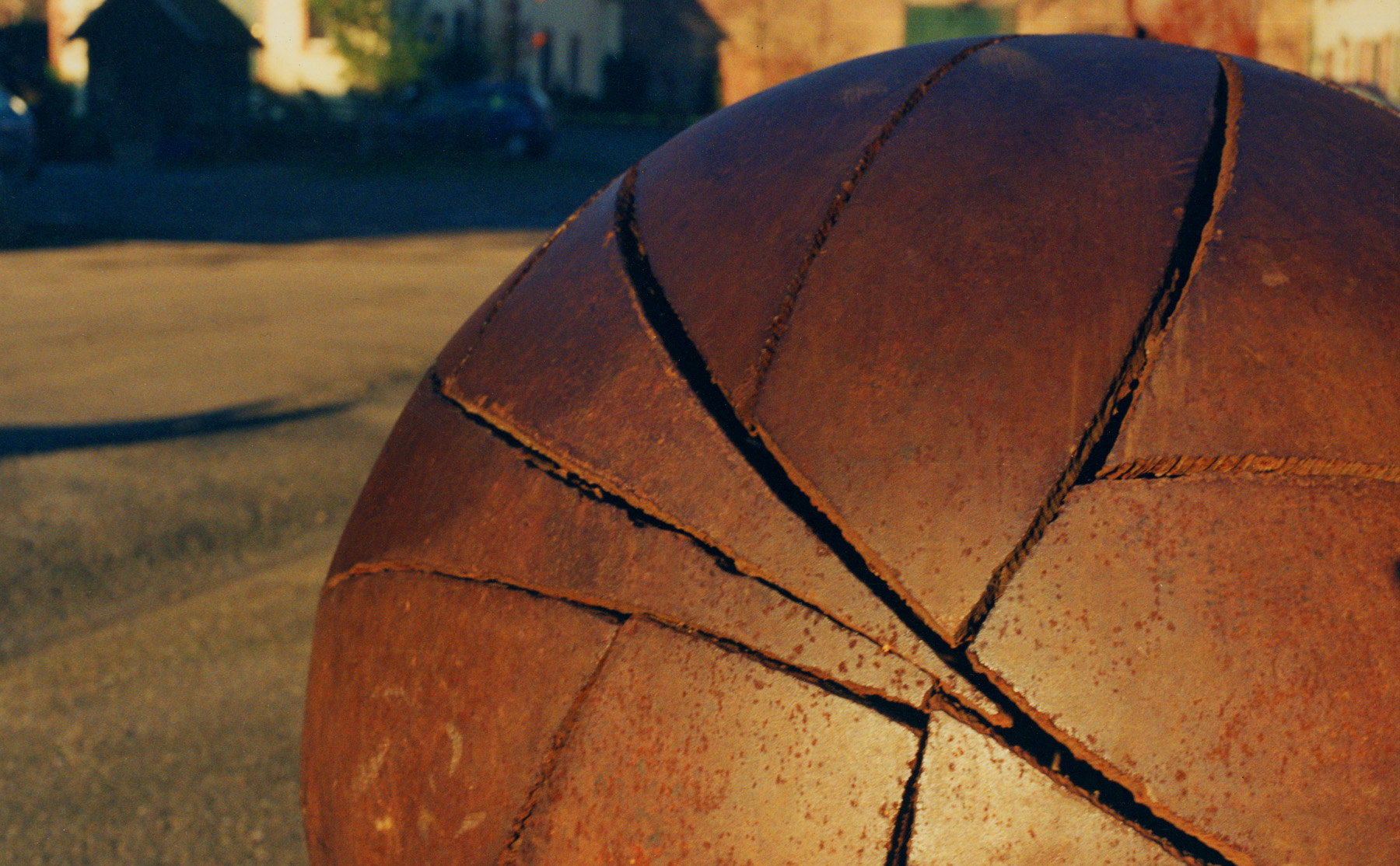 Eine Kugel –massiv und roh steht sie da. Nähte durchziehen ihre Oberfläche.Die Kugel ist zusammengesetzt aus ineinandergreifenden Segmenten. Diese sind aus schweren, mehr als 2cm starken Stahlplatten ausgebrannt und dann in glühendem Zustand zur Kugelfläche geschmiedet. Jedes einzelne Segment hat seine individuelle Form und dadurch seinen genau bestimmten eigenen Platz.