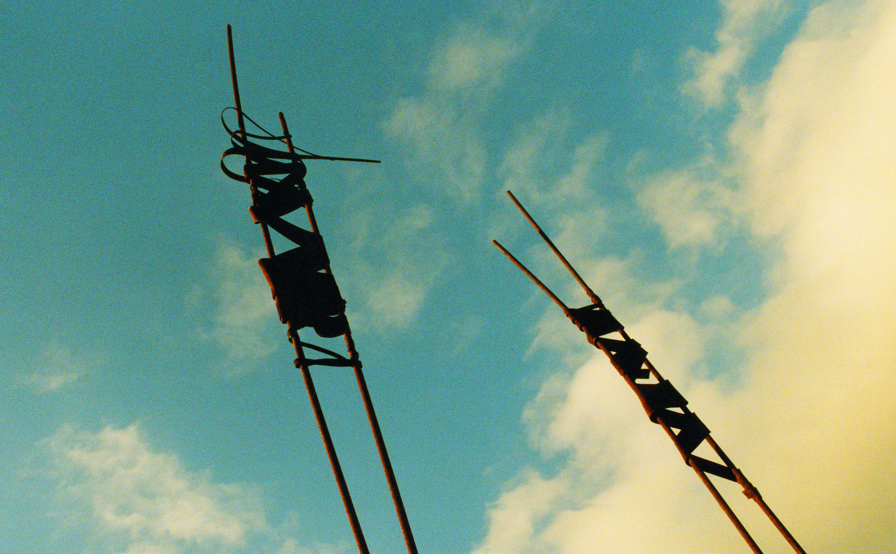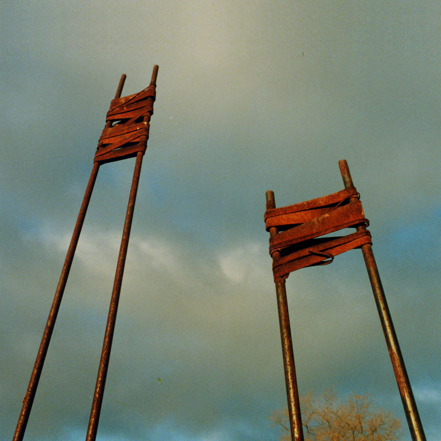 Zwei dicht nebeneinander in den Boden gerammte Stahlstangen, sind am oberen Ende mit Blechfetzen, gleich Tauwerk verzurrt.